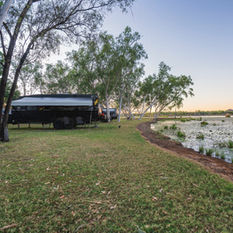 Sites are level, grassy and suitable for caravans, motorhomes and camper trailers. Guests are only metres from the foreshore lawn, where birdlife, reflection pools and the occasional visit from Gummy the freshwater crocodile add character to the setting. Modern amenities, outdoor kitchens and laundries are a short walk away, and the onsite café provides excellent coffee and light meals throughout the day. Free Wi-Fi and optional airport pickup add convenience. For a signature East Kimberley camping experience right on the water’s edge, these premium waterfront sites deliver something special.